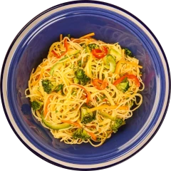 - Corta las zanahorias, pimentones y calabacín en tiras delgadas. Sofríelos junto con los ajos finamente picados. Luego, incorpora el brócoli previamente cocido y mezcla.
