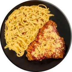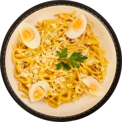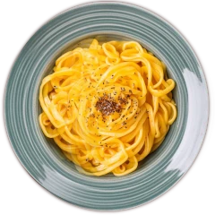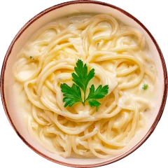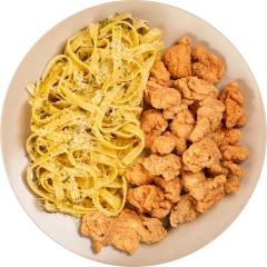 - Añade orégano al gusto al Fettuccini Don Vittorio, sirve en el plato y acompaña con las pipocas de pollo. Finaliza con queso rallado al gusto.